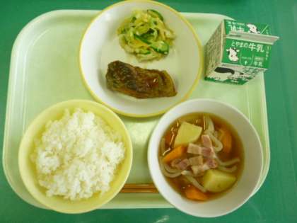 今日の給食は、ごはん、牛乳、魚の梅風味かば焼き、あわせ和え、ベーコンとじゃがいもの煮物です。