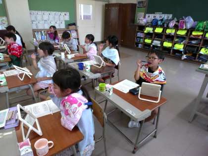 歯磨きの大切さや磨き方のポイントについて確認しました。歯ブラシを細かく動かしたり、当てる強さを確かめたりしながら、ていねいに磨くことができました。