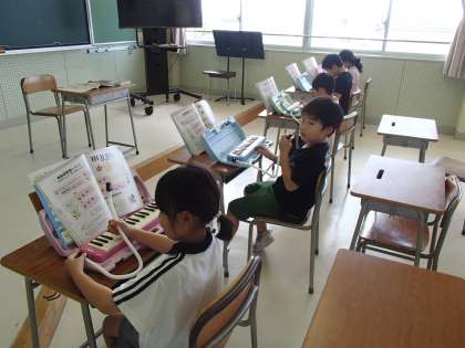 今日は朝から大発見がありました。大切に育てていたあさがおに花が咲きました。子供たちはとても喜んでいました。また、鍵盤ハーモニカの練習もスタートしています。ドレミファソの音で、簡単な曲も弾けるようになりました。