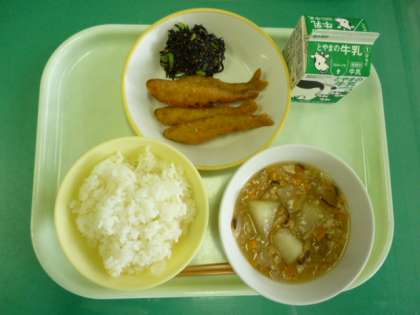 今日の給食は、ごはん、牛乳、わかさぎのフリッター、ひじきのごま和え、冬瓜のそぼろあんです。