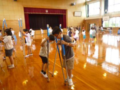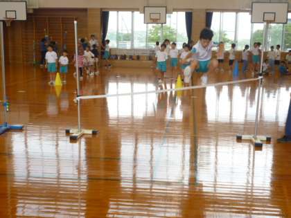 7月の内容は、コーディネーショントレーニングとゴム紐跳び、竹馬です。体力の向上を目指して、時間いっぱい運動しています。