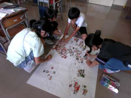 社会科では、産地調べをしました。持ち寄ったちらしを産地ごとに白地図にまとめました。