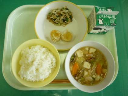 今日の給食は、ごはん、牛乳、にんじんシューマイ、ナムル、えびと豆腐のうま煮です。