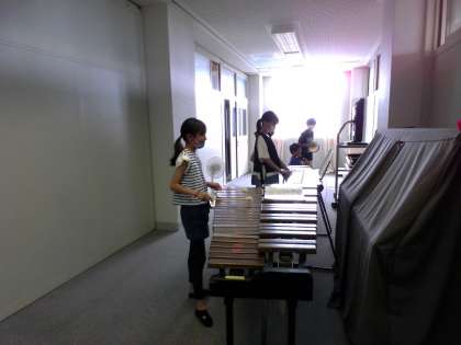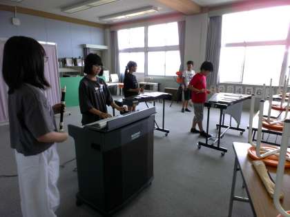 グループで「リボンのおどり」の演奏を練習しています。楽器の重なり方を各グループごとに工夫しています。