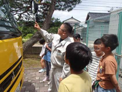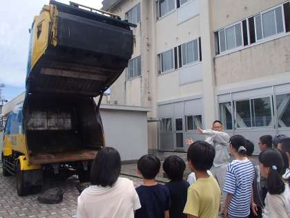 ごみ収集車についての説明を受けました。間近でごみ収集車を見学し、疑問に思ったことを職員の方に質問し教えていただきました。重たいごみを運ぶために、ごみ収集車には多くの工夫があることを学んだ子供たちでした。