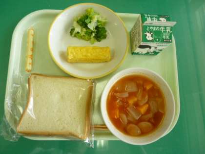 今日の給食は、食パン、牛乳、卵ロール、フレンチサラダ、ミネストローネ、棒チーズです。