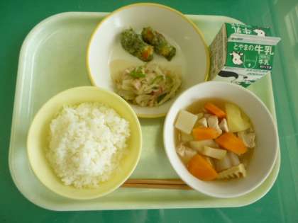 今日の給食は、ごはん、牛乳、ちくわの磯部揚げ、はりはりソテー、鶏肉とじゃがいもの南蛮煮です。