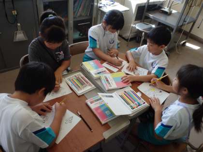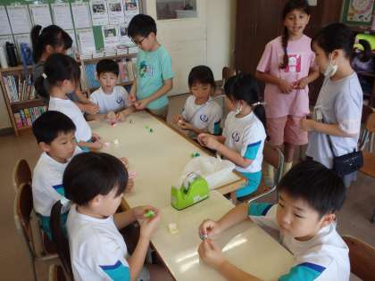 「ぬり絵係」の次は、「工作係」の企画で折り紙のプッシュポップ作りを行いました。