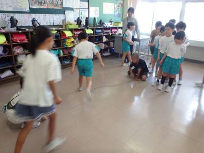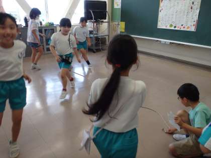 最後は「スポーツ係」の大縄の企画です。まだ大縄を跳ぶことが難しい1年生も楽しめるように、どんな遊びがいいか何度も話し合っていました。おかげで、みんなとても楽しそうでした。
