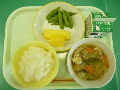 今日の給食は、ごはん、牛乳、厚焼き卵、枝豆、韓国風すきやきです。