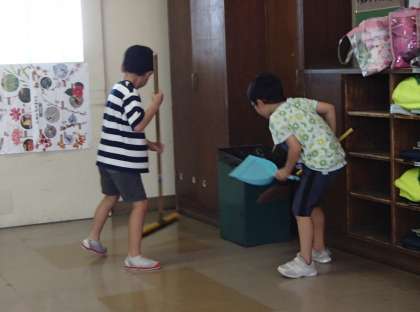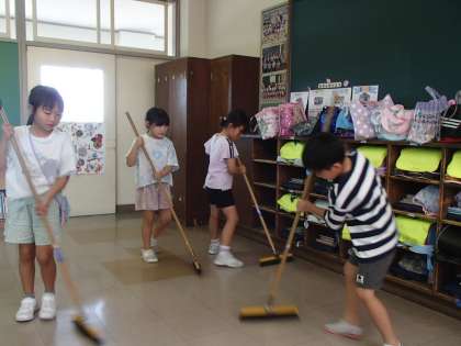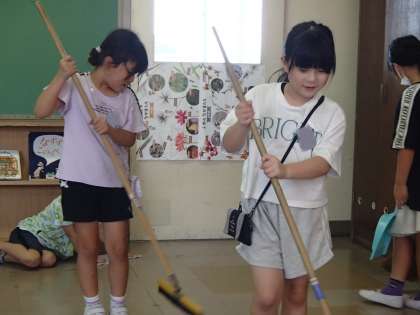 1学期最後の休み時間は、「掃除しよう!」「わたしもやりたい!」と子供たちから掃除タイムが始まりました。ほうきの使い方を友達と確認したり、協力して取り組んだりしていました。