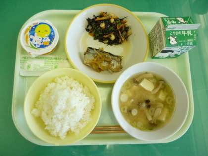 今日の給食は、ごはん、牛乳、さんまの生姜味、大豆とひじきのごま和え、団子汁、お月見ゼリーです。