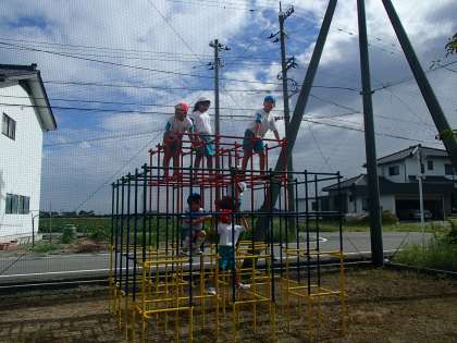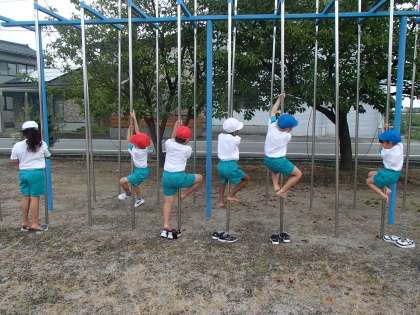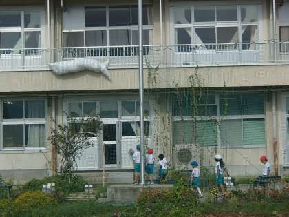 今日は、涼しい時間にグラウンドで遊びました。みんなで登り棒をしたり、ジャングルジムに登って遊んだりしました。ジャングルジムに登ると、「おうい」とくじらぐもで学習しているせりふを言う子供たち。するとなんと!学校にくじらぐもが現れました。教室に飾ったくじらぐもに見守られながら、学習をがんばっています。