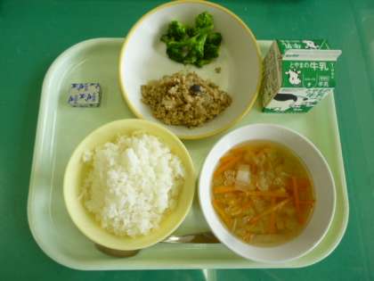 今日の給食は、ごはん、牛乳、とやまのえごま入りガパオライス、ゆでブロッコリー、コーンスープ、ポケットチーズです。