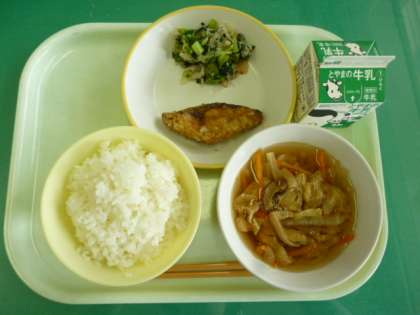 今日の給食は、ごはん、牛乳、魚のかば焼き、梅肉和え、沢煮椀です。