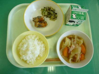 今日の給食は、ごはん、牛乳、ちくわの南部揚げ、磯和え、ベーコンとじゃがいもの煮物です。
