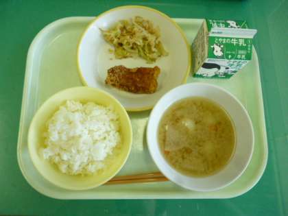 今日の給食は、ごはん、牛乳、豚肉の香り揚げ、いり大豆和え、つみれ汁です。