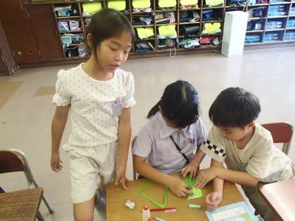 折り曲げてできた形を調べました。始めの形は違っても、折り曲げると同じ形ができることに気付きました。友達と重ね合わせたり、三角定規を当てたりして確認しました。
