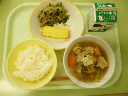 今日の給食は、ごはん、牛乳、厚焼き卵、香味和え、肉豆腐です。