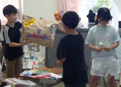 自分の思い付いたものをひもや紙を使って表しました。相談タイムには、「何で貼ったらよいかな」という仲間からの相談があり、みんなで考えました。子供たちは、1学期に学習した接着方法について、それぞれの特徴を思い出しながらアドバイスをしていました。また、ひもの色や素材の違いに着目して、いろいろな材料を使って試していました。