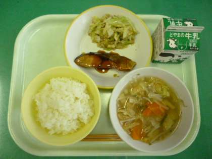 今日の給食は、ごはん、牛乳、ふくらぎの照り焼き、野菜のピリ辛炒め、五目みそ汁です。