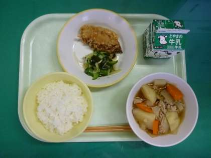 今日の給食は、ごはん、牛乳、さばの竜田揚げ、酢の物、豚肉の炒め煮です。