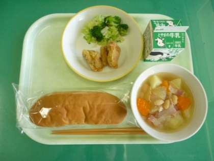 今日の給食は、コッペパン、牛乳、フライドチキン、そえ野菜、豆とベーコンのスープ煮です。