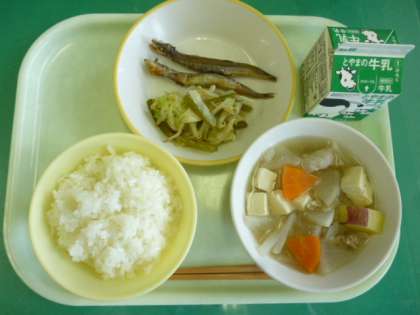 今日の給食は、ごはん、牛乳、ししゃもの米粉揚げ、茎わかめの酢の物、さつま汁です。