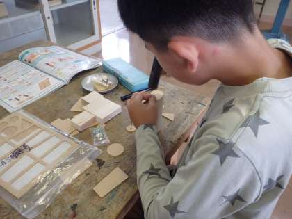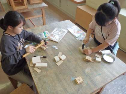 今週から始まった図画工作の授業では、木片にくぎを打つ作品に挑戦しています。初めて釘打ちを経験する子も多く、始めはおそるおそる取り組む様子が見られましたが、すぐにこつをつかんで上手に釘を打つことができていました。