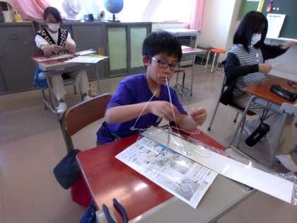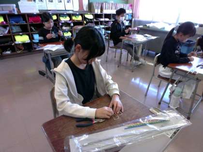 図画工作科では、針金の形を変えたり、組み合わせたりして作品をつくっています。