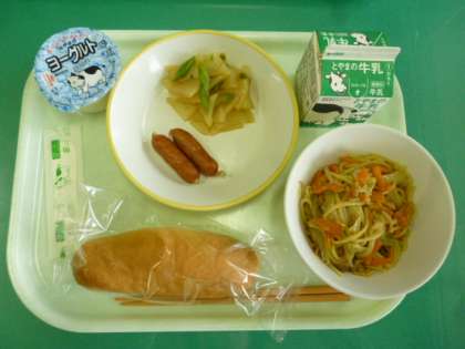 今日の給食は、コッペパン、牛乳、あらびきウインナー、大根サラダ、焼きそば、ヨーグルトです。