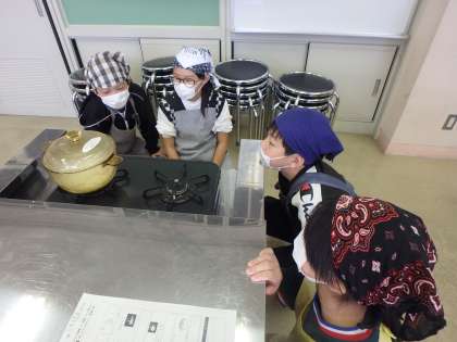 鍋の中の様子をよく見ながら、コトコト聞こえる音を聞いたり、においを感じたりしてご飯を炊きました。