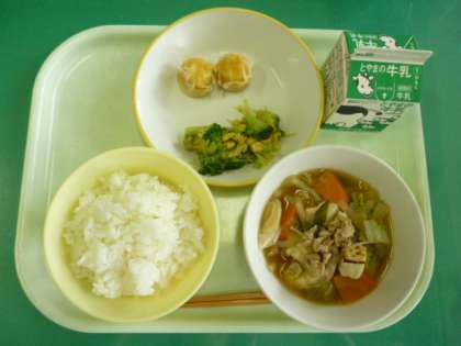 今日の給食は、ごはん、牛乳、にんじんシューマイ、コーン和え、豚すきやきです。