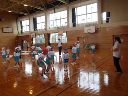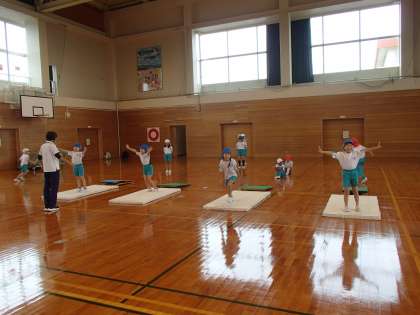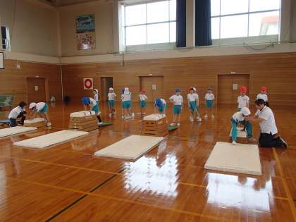今日は富山市スポーツ協会より2名の先生を招いて、跳び箱の指導をしていただきました。高い段数を跳ぶのではなく、きれいに跳ぶ跳び方を指導していただき、手の動かし方や足の開き方など、丁寧に教えていただきました。