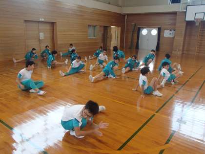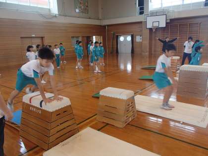 富山市スポーツ協会から指導員の方をお招きし、跳び箱の出前授業をしていただきました。安定して台上前転ができるこつ等を教えていただきました。