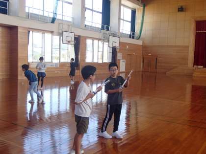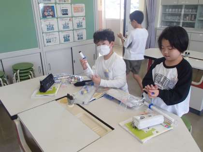 理科「とじこめた空気と水」の学習では、空気鉄砲で遠くにスポンジを飛ばすためにはどうすればよいか、実験を通して考えました。