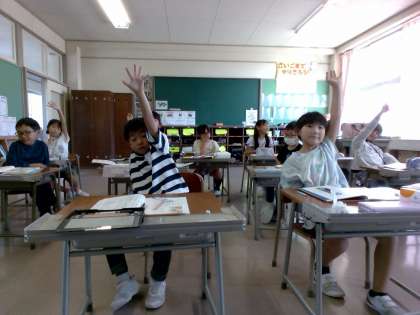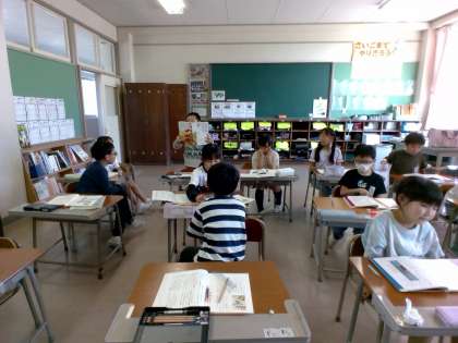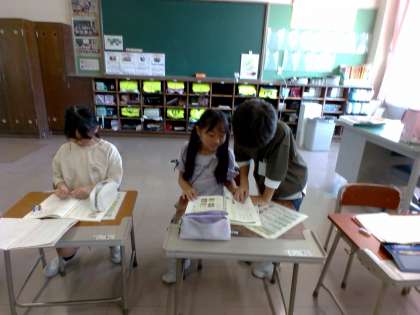 主語と述語を見付けて線を引きました。友達と教え合って考える姿も見られます。