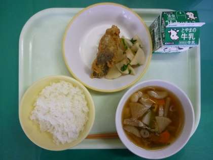 今日の給食は、ごはん、牛乳、魚のえごま揚げ、かぶの色どり、根菜汁です。