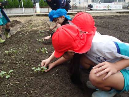 ずっとニンジンの芽が出ず、みんなで心配していたのですが、今日観察に行くと、藁の隙間から芽が出ていました。また、ダイコンについて調べている子供たちから、間引きの説明をしてもらい、みんなで間引きをしました。みんなで協力してお世話を頑張っています。