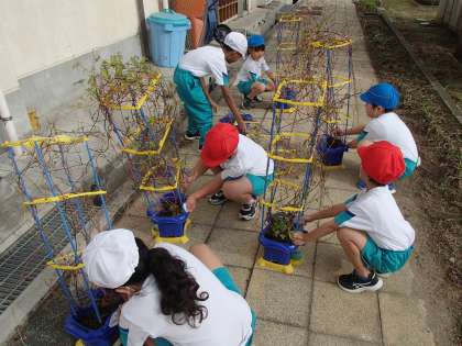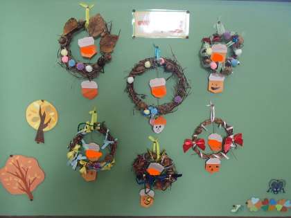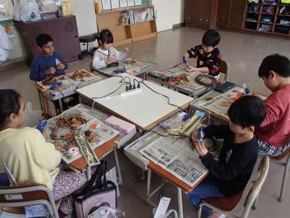 生活科で育てたあさがおのつるを使って、リースを作りました。巻き付いたつるを取るのに苦戦していた子供たち。一生懸命育てたおかげで、しっかりとしたつるのリースの土台ができました。グルーガンを使って、校外学習で拾ってきたどんぐりや落ち葉、松ぼっくりなどを飾りました。また、家から持ってきた材料も使って、華やかなリースが完成しました。階段踊り場に飾ってありますので、学習参観の際にぜひご覧ください。