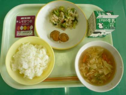 今日の給食は、ごはん、牛乳、ほたての照焼き、切干大根のペペロンチーノ、かきたま汁、しそかつおふりかけです。