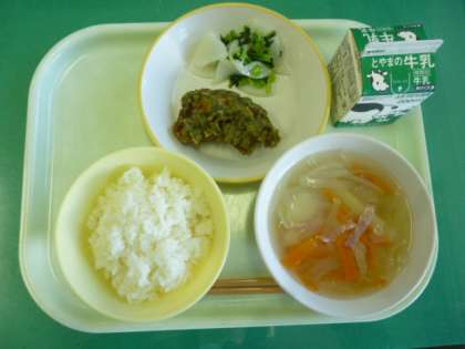 今日の給食は、ごはん、牛乳、豚肉の磯辺揚げ、かぶのサラダ、ポテトスープです。