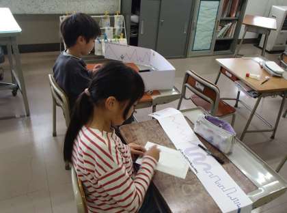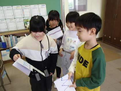 作品カードを書いたり、自分の作ったお話を紹介したりしました。友達の作ったお話を聞いて「最後がおもしろいね」「色や形が変わるところがすごいね」と感想を伝え合っていました。