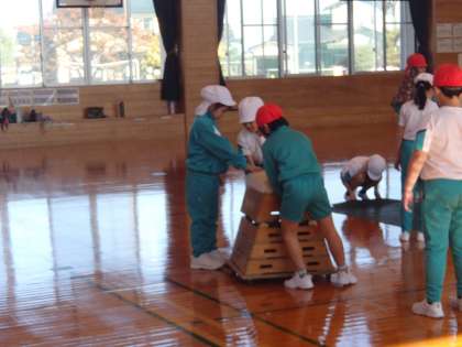3・4年生の体育では、跳び箱の学習をしています。準備や後片付けも、仲間と協力しながら行っています。