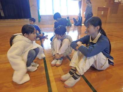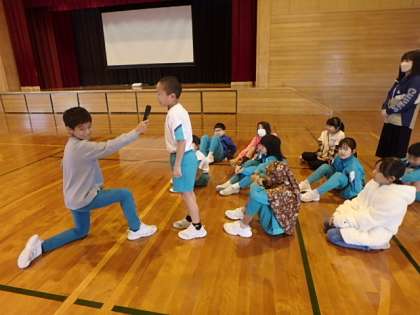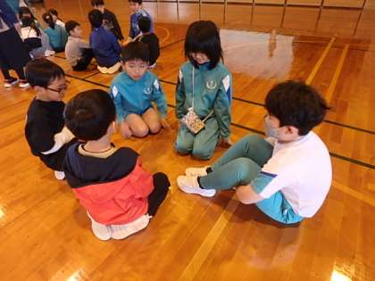 「猛獣狩りゲーム」では、他学年の人とグループを作り、好きな食べ物や教科、遊びなどを伝え合いました。