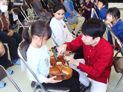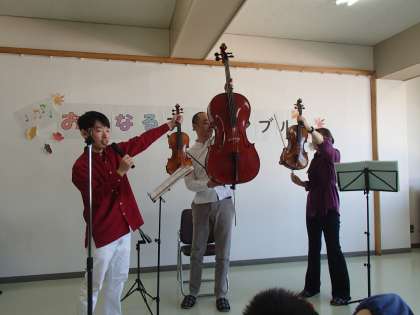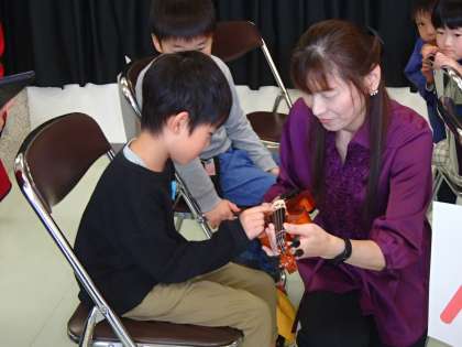今日の世代間交流では、まず始めに、弦楽器の演奏を聴いたり、実際に楽器に触れたりしました。弦楽器に触るのが初めての子供たちは、「弦を弾くのは痛かった」「意外と軽くてびっくりした」という感想をもっていました。