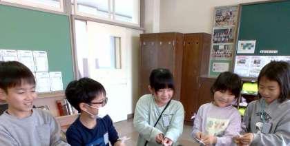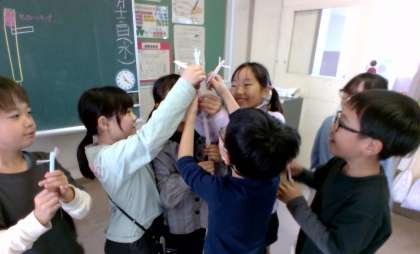 ストローで動く仕組みを作りました。縦に並べたり、矢印にしたりしながら、みんなで動きや形を楽しみました。そして、思い付いた飾りを貼り付け、人や魚に変身させました。