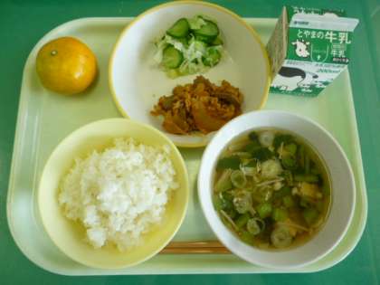 今日の給食は、ごはん、牛乳、豚肉とレバーのケチャップソース炒め、そえ野菜、すまし汁、みかんです。