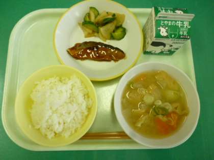 今日の給食は、ごはん、牛乳、ふくらぎの照り焼き、大根のえごまサラダ、具だくさん汁です。