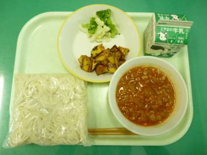 今日の給食は、ソフト麺のミートソースかけ、牛乳、大学いも、花野菜サラダです。